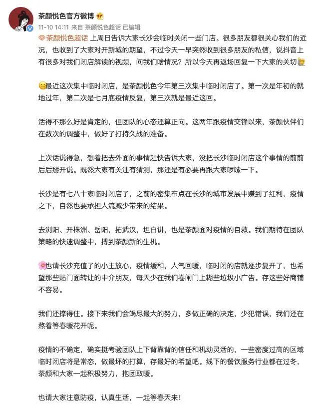 今天下午,茶颜悦色官方微博就长沙七八十家门店临时关闭作出回应。我们先来看看官微的说明: