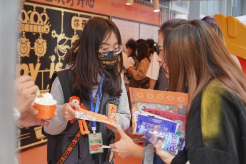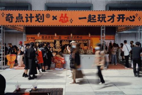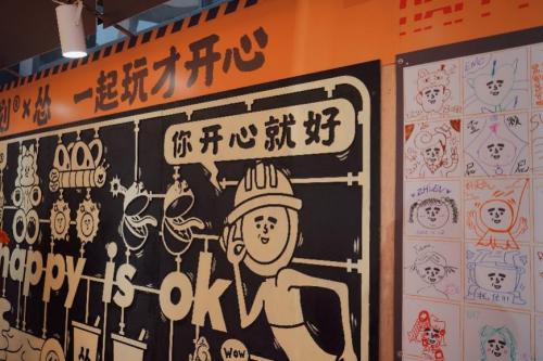 而是采用了“怂x奇点,一起玩才开心”的主题概念,包装了一系列的开心活动,比如:全是开心画面的“开心流水桌”、可以开心涂鸦的“怂厂长表情百变墙”、“开心雪糕机”、和艺术家联名的“你开心就好”零件墙、展馆内寻找“开心贴纸”……