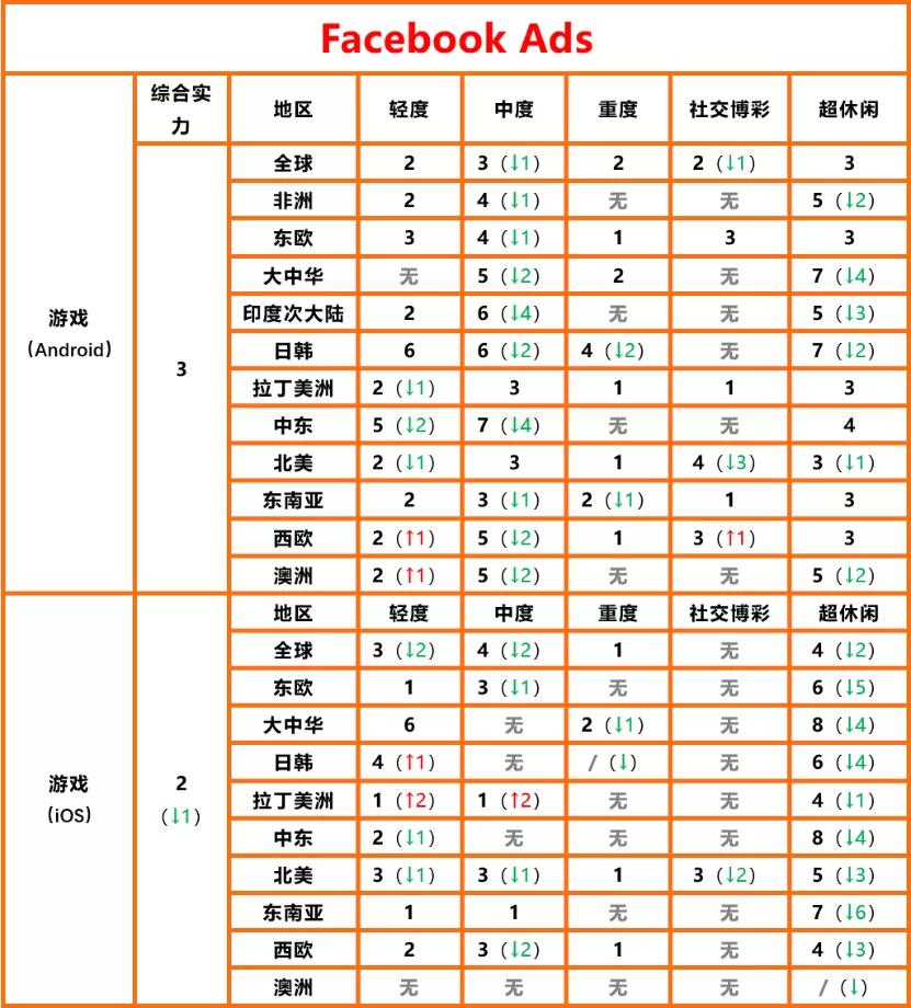 当然,Facebook的下滑显然并没有仅仅体现在iOS端,在安卓端也是如此,虽然Facebook还是维持着世界第一的规模水平,但《Appsflyer广告平台综合表现报告第13版》来看,Facebook虽然整体排名没有大幅下降,但在全世界范围内的绝大多数市场都有所下滑。