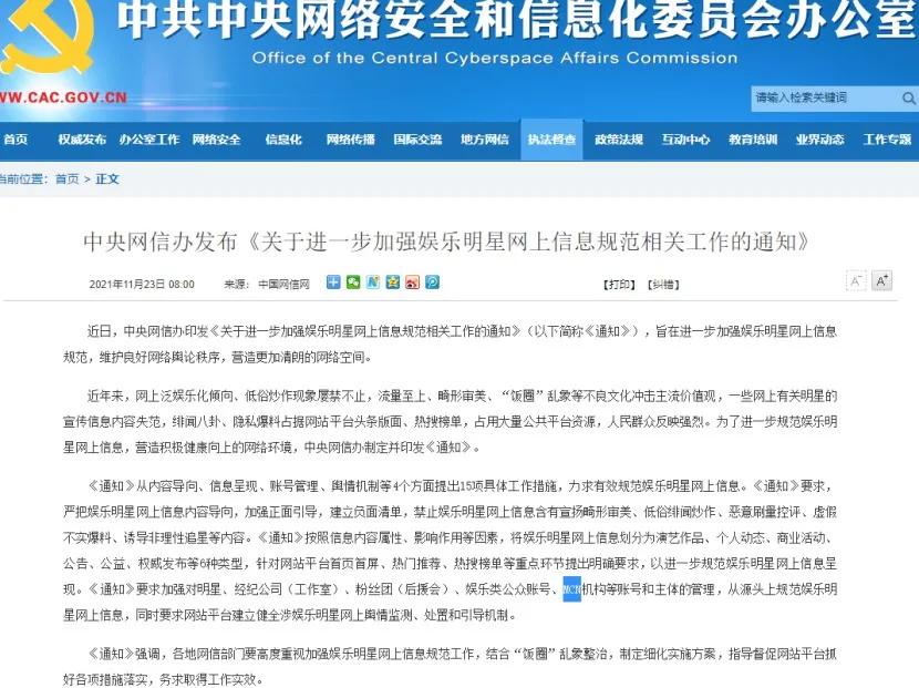 日前,中央网信办印发的《关于进一步加强娱乐明星网上信息规范相关工作的通知》也指出,加强对明星、经纪公司(工作室)、粉丝团(后援会)、娱乐类公众账号、MCN机构等账号和主体的管理,从源头上规范娱乐明星网上信息,同时要求网站平台建立健全涉娱乐明星网上舆情监测、处置和引导机制。