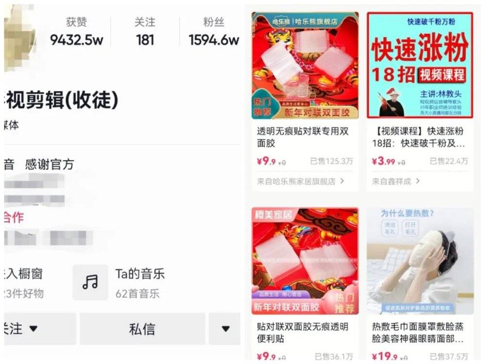 在抖音上,一个粉丝量为1000万左右的剪辑账号下的橱窗中显示,短视频运营的视频课程已卖出近23万件。除此之外橱窗内其他物品很多也已经卖出了10万+,带货变现能力不容小觑。