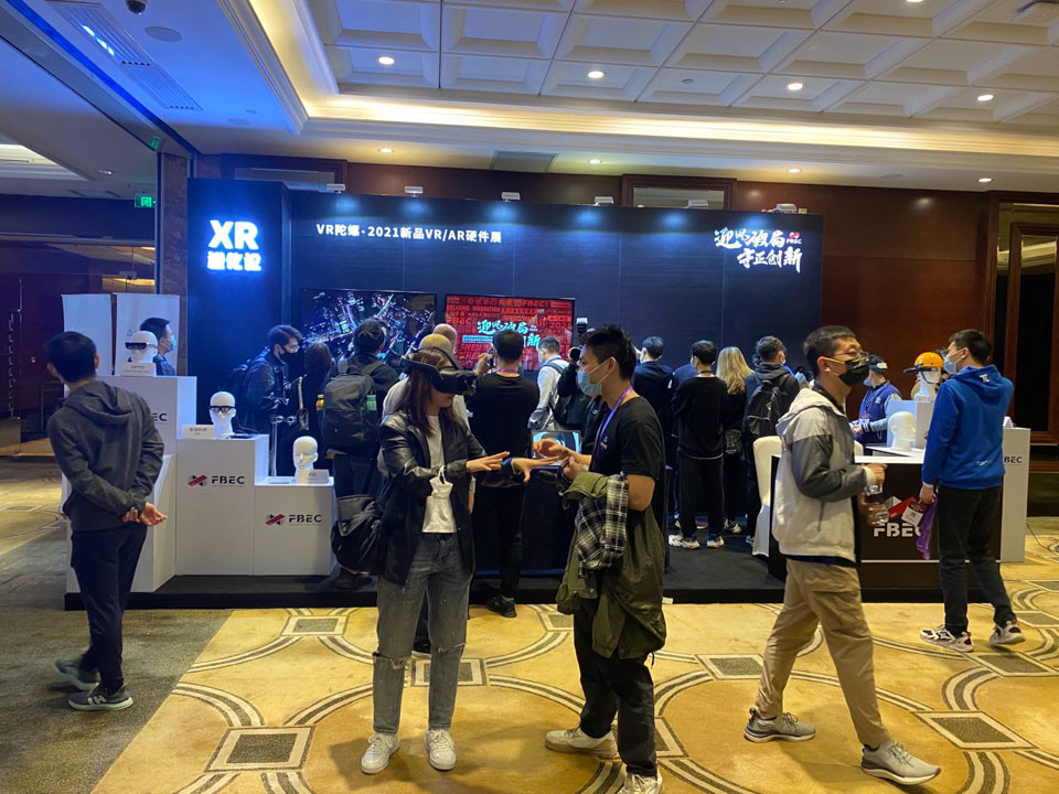 在2021未来商业生态链接大会上,体验VR、AR产品者络绎不绝,热门产品需要排队才能试戴。