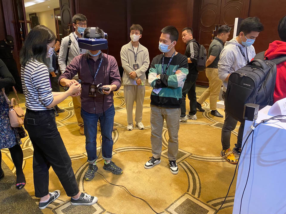 在当日大会的多个互动展区中,记者看到“XR进化论”展区前一直人头攒动,那里展示了2021年上市的二十多款年度AR/VR头显设备新品。去体验的人络绎不绝,像HTC Vive和Pico这类受欢迎品牌的产品总是需要排队才能试戴。