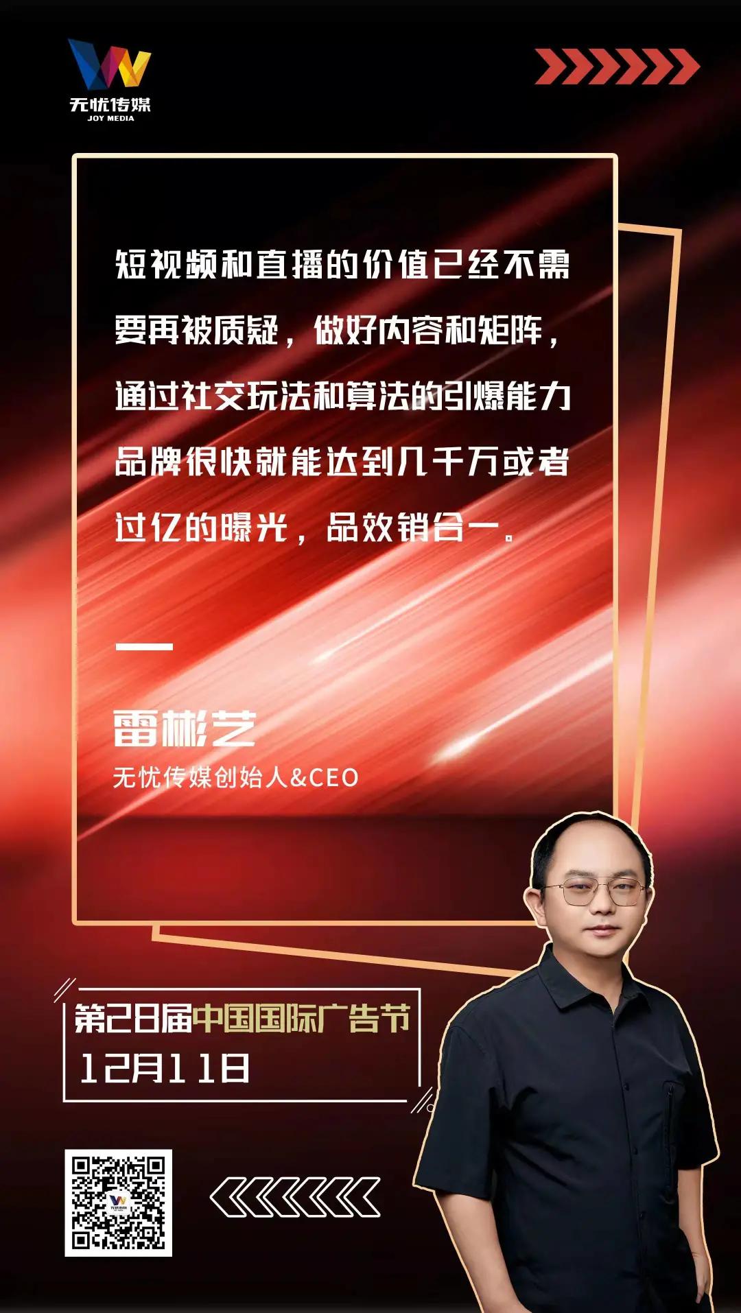 无忧传媒创始人&CEO雷彬艺出席了第28届中国国际广告节主论坛,发表了以《上市即爆款:短视频+直播构建品牌营销新标配》的演讲。现场频出金句,雷彬艺凭借多年的行业经验对市场现状进行了深入浅出的剖析,从营销的角度分享了品牌如何通过社交玩法和算法引爆能力,迅速获得千万甚至过亿的曝光并实现品效销合一。演讲后,雷总还接受了媒体专访。