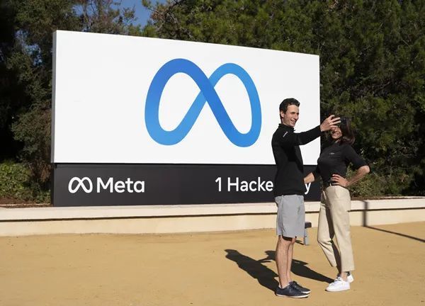 今年10月,美国社交媒体巨头脸书宣布更名为“元”(Meta),聚焦元宇宙。图为在美国旧金山湾区,人们在“元”标志牌前留影。(图片来源:新华社)