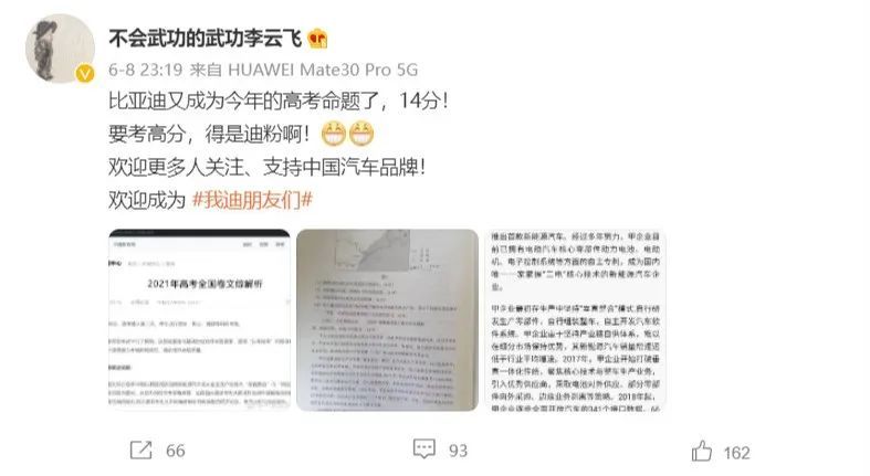 阅读材料上写着,这是一个“知名民族品牌”,“是目前国内唯一掌握三电核心技术的新能源车企”,这种只差报身份证的让“迪粉”们心里乐开了花,比亚迪高管也在第一时间送上辣评:要考高分,得是迪粉!