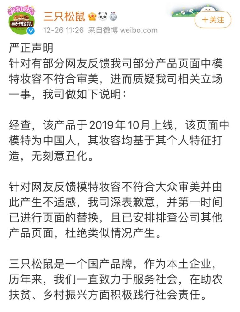 三只松鼠两年前发布的一则产品宣传海报,近日在网上引发轩然大波。有网友认为这个海报中的模特“眯眯眼”加上厚嘴唇等元素,是在故意丑化中国人。为此,三只松鼠紧急发表声明,表示海报中的模特是中国人,妆容基于其个人特征打造,无刻意丑化。为了避免产生不适感,目前已经进行页面的替换,三只松鼠还对网友表示了道歉。