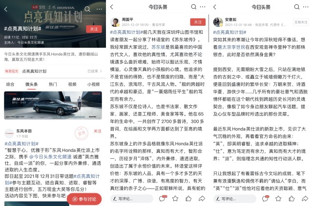 2021年11月24日至12月31日,今日头条文化频道携手东风Honda英仕派发起“点亮真知计划”主题活动,号召平台广大创作者踏上这趟知识旅程。活动邀请到数十位行业名人、文化学者,以及万千知识爱好者加入这场知识分享盛宴,一道翻阅山海,点亮真知。