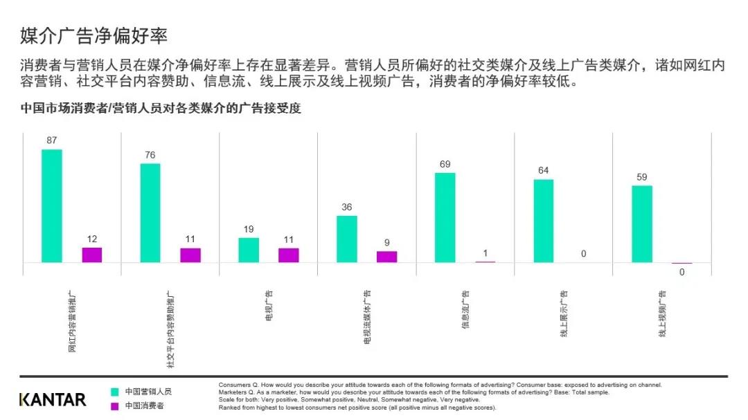 此外,很多营销人员认为,什么营销方式流行,就应该无限跟进。但事实上, 凯度中国最新推出的《Media Reactions 2021》指出,营销人员与消费者对不同渠道广告的接受度存在差异。例如,营销人员偏好率高达87%的网红内容营销,消费者却往往无感,偏好率仅在10%左右甚至以下。