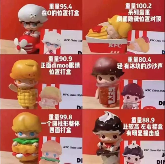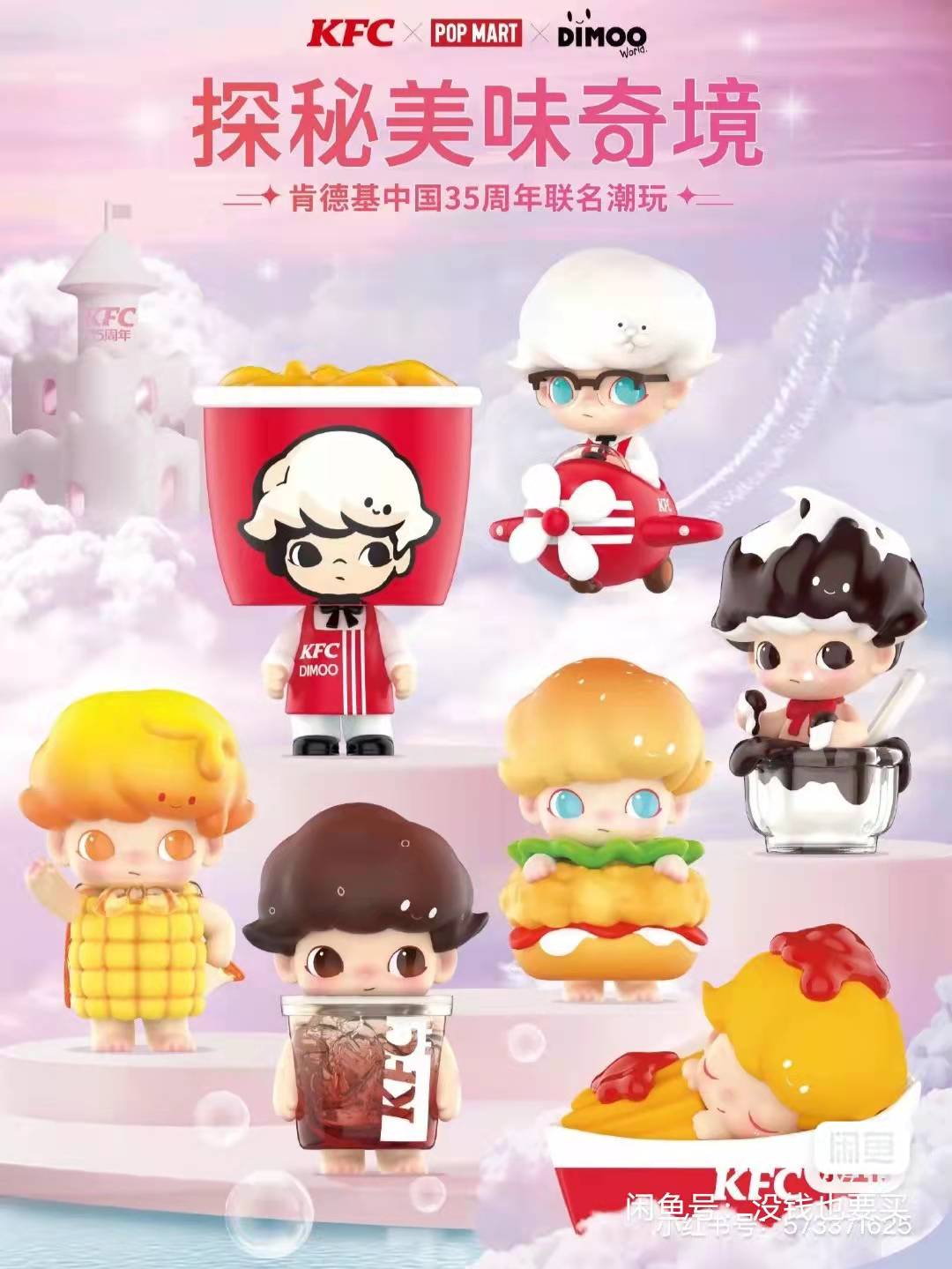 1月4日上午十点半,打工人还沉浸在假期综合症中,肯德基中国35周年KFC×泡泡玛特DIMOO手办发售。根据规定,消费者只需在肯德基购买价值99元的指定套餐,才能获得盲盒1个。据了解,这一系列的盲盒总共7款形象,6个常规款+1个隐藏款,6个成1盒,全国总共发售26万份,抽中隐藏款概率为1:72。
