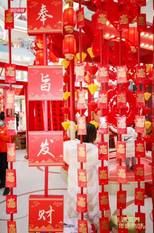 走进“庙会”牌坊,马上就被浓浓的年味包围,整个合生汇中庭都被调成了“年味红”模式,红红的背景、红包构成的墙,加上及地的红灯笼,都寓意着来年的红红火火。