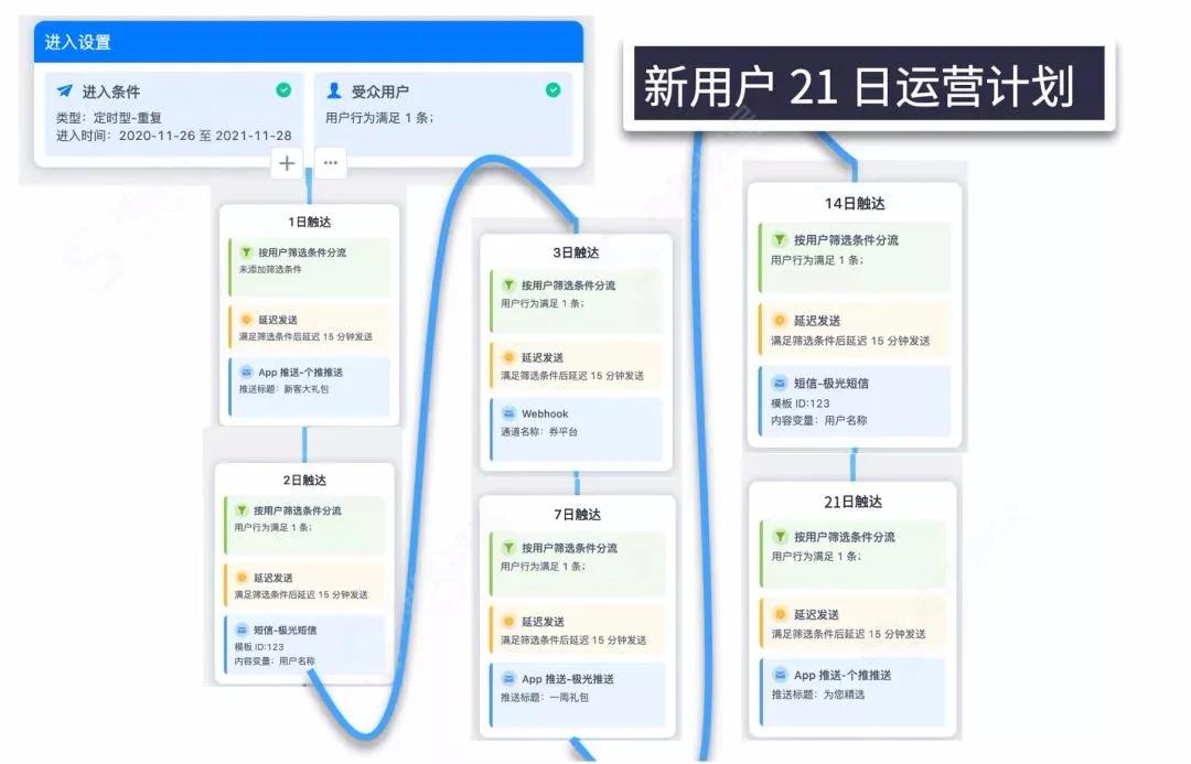 通过以上数据分析,惠买在线决定把运营资源集中在新用户来到平台的前 21 天,并随着时间的推移逐渐减少运营密度。在具体实践过程中,惠买在线制定了“新人 21 天运营计划”,在第 1、2、3、7、14、21 天分别对用户进行不同时机的 Push、优惠券、短信和积分等的下发。