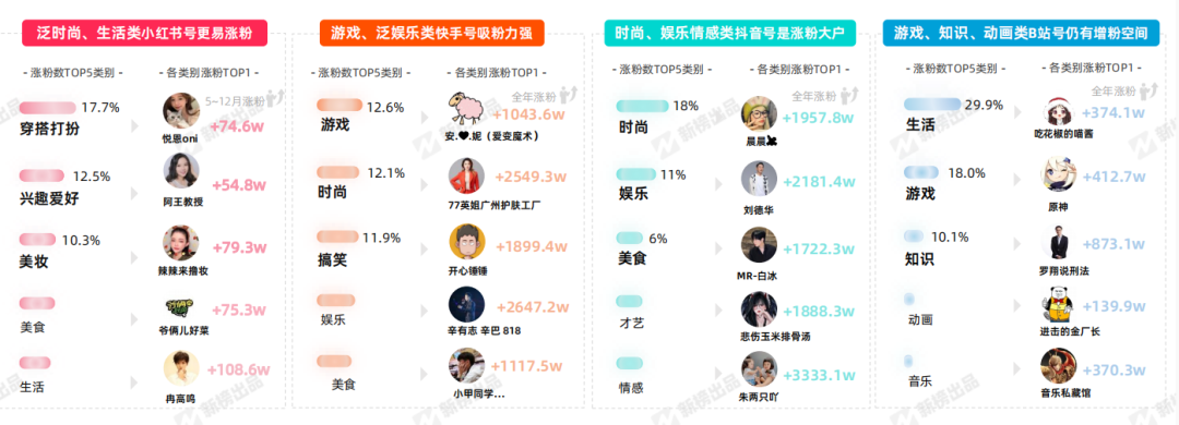 新榜发布的《2021年新媒体内容生态数据报告》显示,小红书在整体涨粉最多的穿搭打扮类别中的TOP1只涨了74.8w粉,而快手、抖音和B站分别有 2549.3w、3333.1w和873.1w的涨粉,相差了11-34倍。