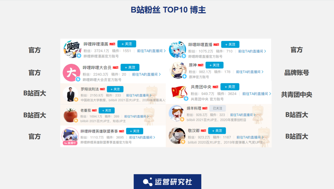 对比之下B站粉丝数量TOP10,就有4个百大UP主账号,@罗翔说刑法和@老番茄等。