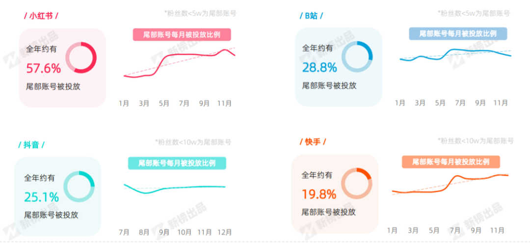 根据新榜数据报告,全年小红书有57.6%的尾部账号被投放,是别家平台的2倍以上。