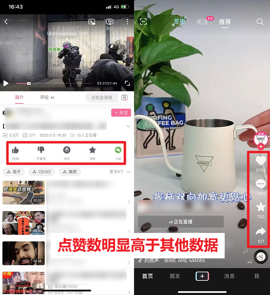 而且在抖音、B站、快手,都是以点赞为主要互动(B站用户更喜欢一键三连)。