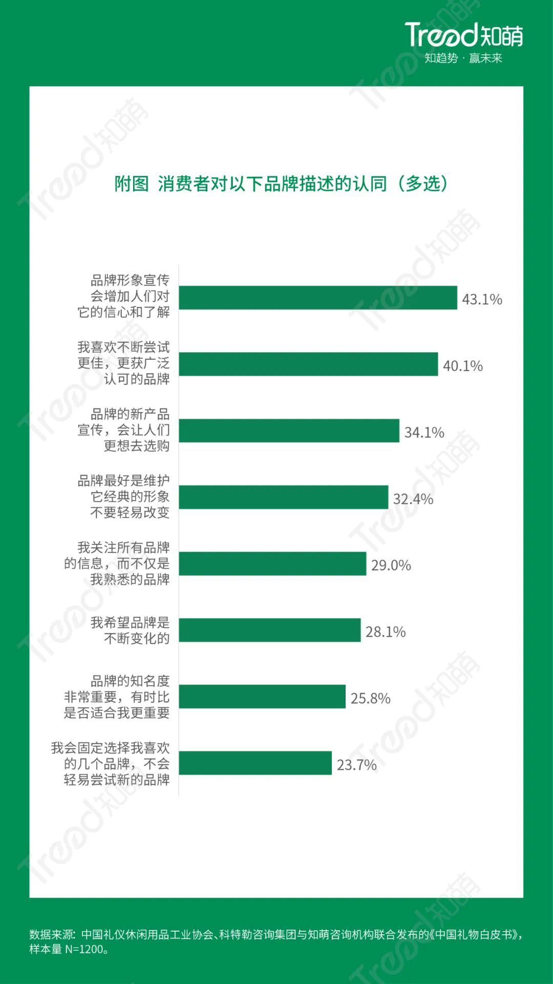 知萌咨询机构《2022中国消费趋势报告》指出,在品牌建设中,消费者认知资产的积累是非常重要的。调查显示,43.1%的人认为品牌形象的宣传会增加对它的信心和了解;40.1%的消费者更愿意尝试获得广泛认可的品牌;32.4%的消费者认为品牌的形象一定要持久地去维护。这意味着今天的品牌很容易被消费者遗忘,品牌想要长期印记于消费者的头脑中,需要进行持续的品牌传播,而不是仅仅靠一次两次的“爆点”和“热点”。