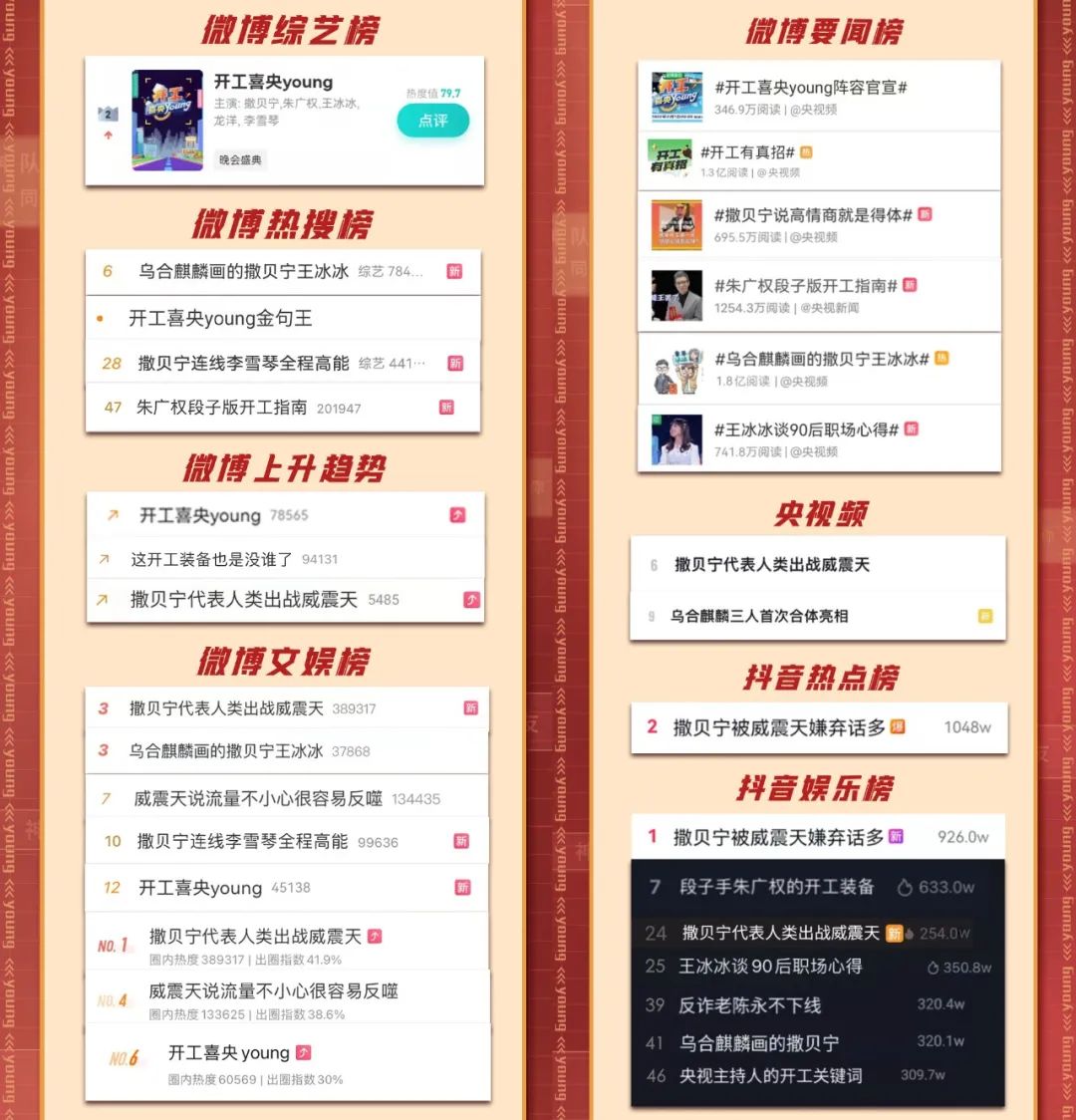 全国首档“开工盛典”《开工喜央young》,以独具匠心的策划、网感十足的设计火速破圈,点燃年轻人的职场正能量。节目清新活泼,用满满的元气、喜气和虎气,鼓舞踏上新征程的追梦人各凭真招,在自己的岗位上闪闪发光。《开工喜央young》全网收获热搜59个,相关话题阅读总量超过12亿,相关视频总播放量超5亿,其中节目上线直播总观看人次超2600万,央视频端内播放量超3500万。融媒体触达受众超3.8亿,登上微博综艺影响力榜第二位。