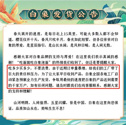 流量的激增,也直接体现在白象产品的销量上。近日,天猫白象官方旗舰店贴出一则公告称,因近期销量暴增,白象全国各地工厂启动紧急预案全力生产,争取用最快的速度将消费者下单的商品发出。
