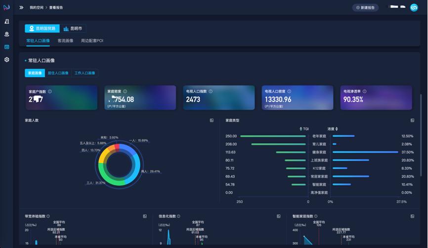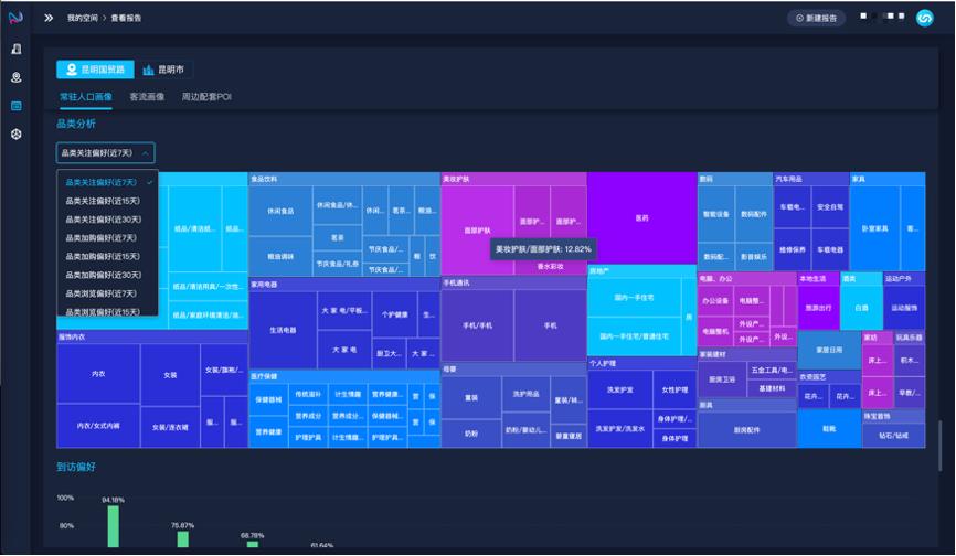 提供门店多维画像服务,释放线下⻔店周边⽣态画像,居⺠密度、流动⼈⼝、内容偏好、线下到访业态以及对应区域线上电商数据画像等14层GIS⼤数据,覆盖120种经营辅助指标。