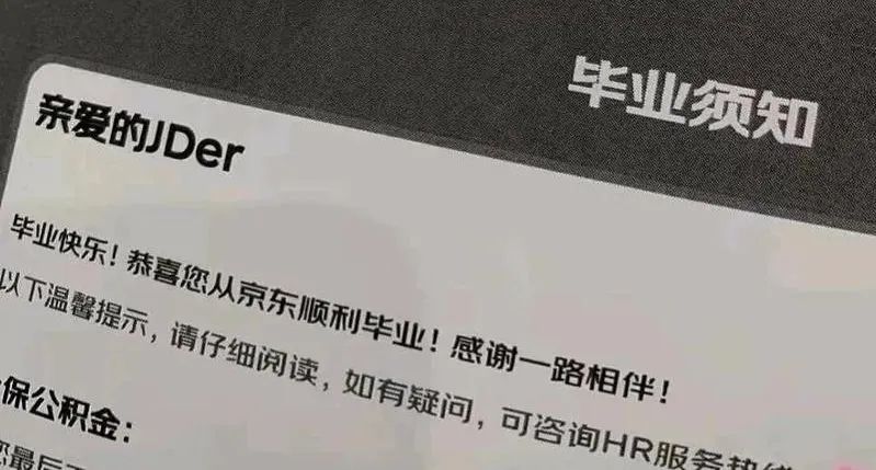在爆料的资料中,京东的HR将裁员信称之为“毕业须知”,并在开头写道“毕业快乐!恭喜您从京东顺利毕业!感谢一路相伴!”内容包括离职后社保公积金、人事档案等如何办理,以及申请背景调查、签发离职证明该走什么样的程序等。