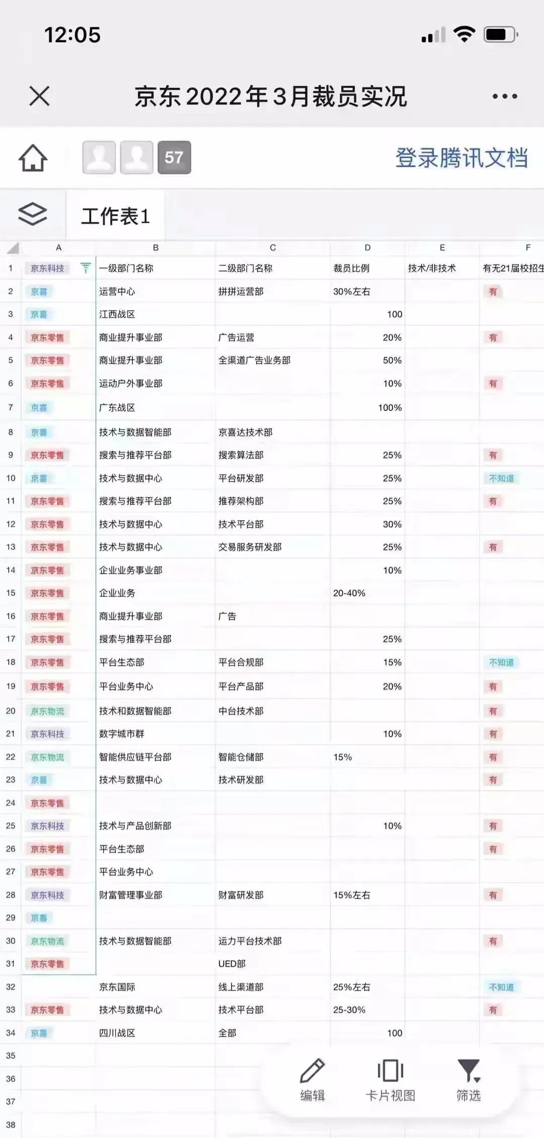 据网传的一份文档显示,此次裁员覆盖业务线较广,京喜、京东国际、京东零售、京东物流、京东科技等多个板块的多个事业部都设置了裁员比例,多数在10%~30之间,其中京喜广东战区裁员比例更是高达100%。