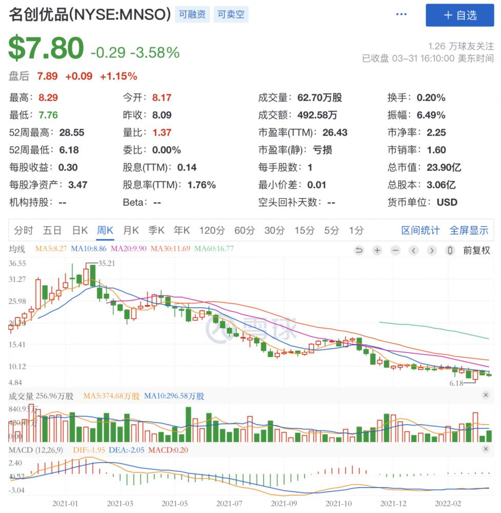 此后,名创优品股价便陷入“跌跌不休”。截至美东时间2022年3月31日收盘,名创优品收盘价为7.80美元/股,总市值约23.90亿美元,市值已蒸发近80%。