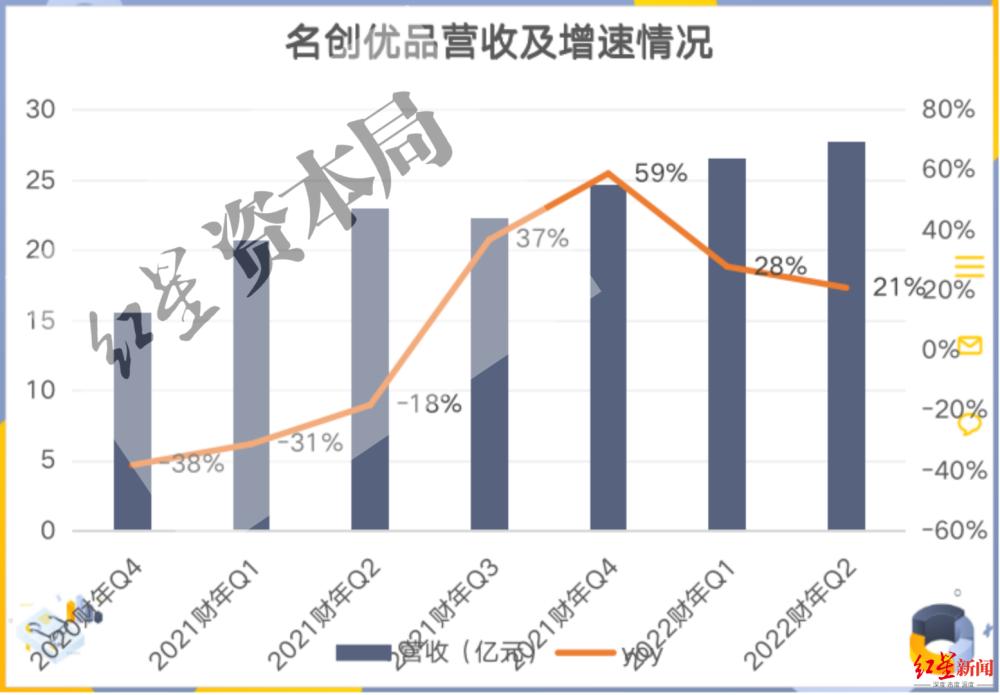 根据名创优品财报,2022年财年第一季度,名创优品的营收增速开始有所放缓,近三个季度分别为59%、28%、21%。