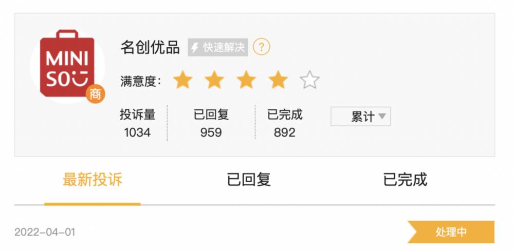 截至2022年4月1日,黑猫投诉相关名创优品的有效投诉为1034条,反馈问题包括质量问题、服务问题、退货问题等。