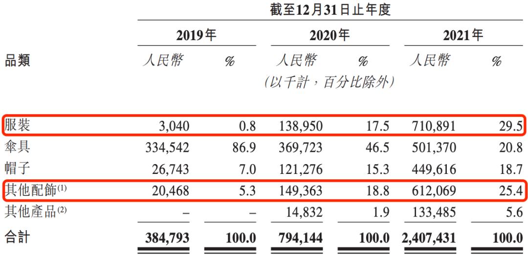 据其招股书显示,在越来越多新品推出后,蕉下原本主打的防晒伞具品类营收占比一路下滑,从2019年的86.9%降至2021年的20.8%。反而是2019年营收占比仅有0.8%的服装品类(以防晒系列和保暖系列为主),在2021年成了第一支柱品类,营收占比达到29.5%。而配饰系列(包括墨鏡、口罩、披肩、袖套及手套等)的营收占比从2019年的5.3%升为2021年的25.4%,成为第二支柱品类。