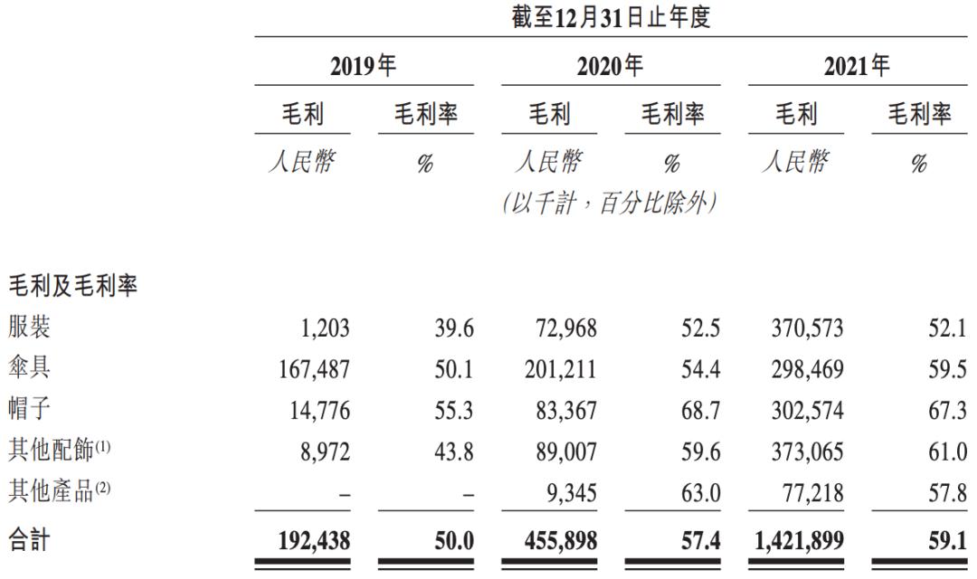 过去三年里,蕉下毛利润分别为1.9亿元、4.6亿元和14.2亿元,毛利率分别为50.0%、57.4%和59.1%。