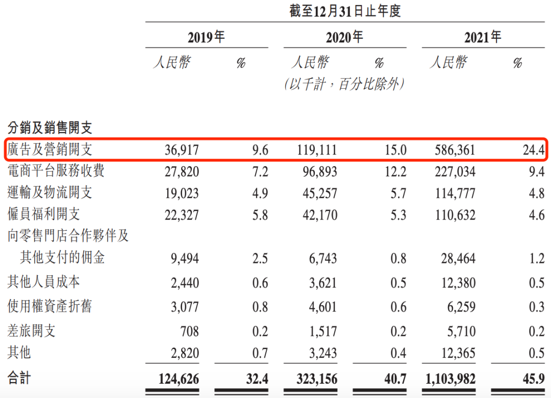 2019年-2021年,蕉下分销及销售开支“吃掉”了收入的32.45%、40.7%和45.9%。到2021年,广告及营销费用约5.9亿,是公司全年收入的四分之一。