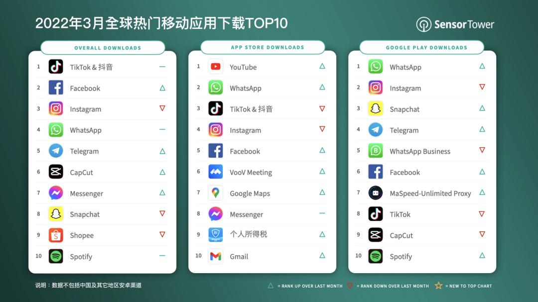 根据移动应用商业情报分析机构Sensor Tower数据,2022年3月抖音及其海外版TikTok以超过6300万下载量,蝉联全球移动应用(非游戏)下载榜冠军,较2021年3月增长9.1%。其中,抖音的下载量占11.2%,TikTok美国市场的下载量占比为10.7%。