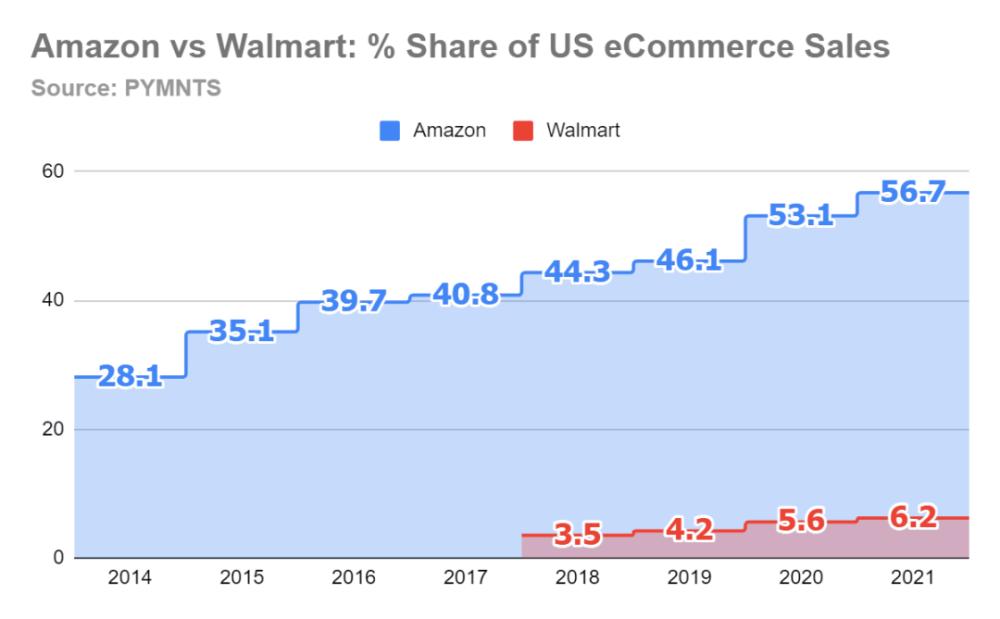 相比之下,在疫情期间,沃尔玛在美国国内数字零售销售中的份额增长了近50%,到 2021 年末在市场占有率达到6.2%。