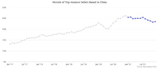 下图显示了中国卖家在亚马逊市场中的份额。中国卖家的份额从 2017 年 1 月的16.14% 逐渐增加到 2020 年 12 月的 42.3%,但在 2021年亚马逊收紧监管的情况下增长放缓,2021 年 12 月为 36.9%。