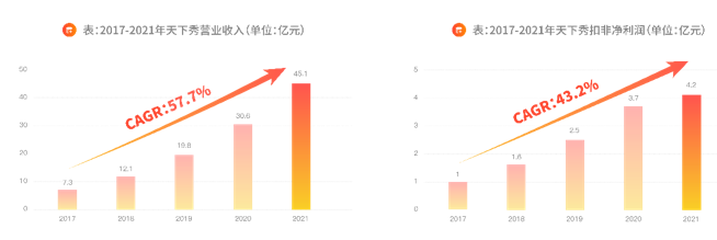 早就布局红人经济的天下秀,业绩也迎来了稳定爆发,2019年-2021年营收分别为19.8亿元、30.6亿元、45.1亿元,复合年均增长率达到了惊人的57.7%。