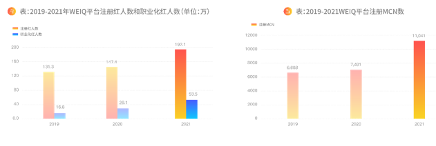 平台注册红人账户数累积达到192万,具备成功接单能力的职业化红人账户数达到 53.5 万,同比增长24.4万;入驻的MCN机构的数量达到 11041家,同比增长7491家。