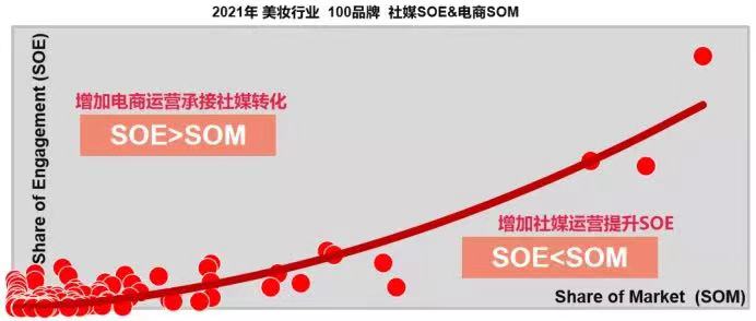 我们还做了一张图,2021年美妆行业100品牌,在社交媒体上的SOE(Share of Engagement),与在电商平台的市场份额SOE(Share of Market),呈现高度相关性,这也证实了社媒对于增长的意义。