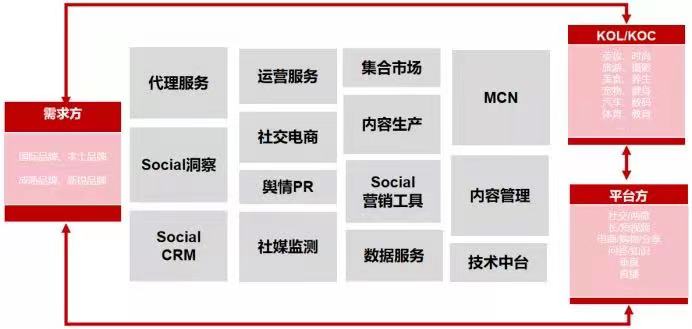 从技术维度看,社媒营销催生了新的品类SoTech。区别于广告技术、营销技术的逻辑,SoTech涉及到三方,需求方通过KOL和KOC,在平台方上与用户互动。这中间不止是流量经营,还涉及到内容、关系、技术、数据、分发等。