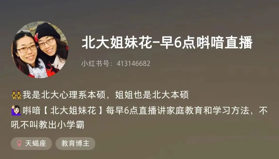 比如在小红书涨粉很快的@北大姐妹花,分享内容主要是亲子教育、心理学相关知识等,目前已经积累了53.2W的粉丝,可她的昵称后缀上却明晃晃地写着:早6点唞喑直播。