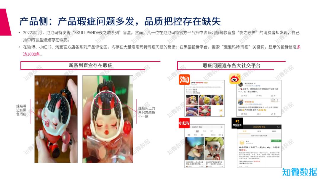 2022年1月,泡泡玛特发售“SKULLPANDA夜之城系列”盲盒。然而,几十位在泡泡玛特官方平台抽中该系列隐藏款盲盒“夜之守护”的消费者却发现,自己抽中的盲盒娃娃存在瑕疵。