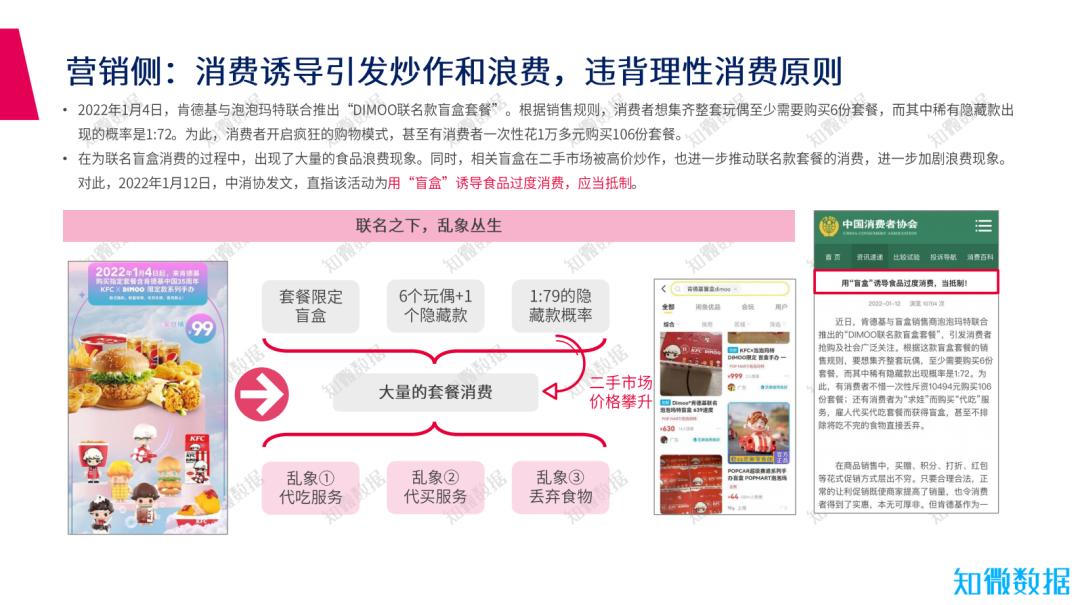 2022年1月4日,肯德基与泡泡玛特联合推出“DIMOO联名款盲盒套餐”,在联名盲盒消费的过程中,出现了大量的食品浪费现象。同时,相关盲盒在二手市场被高价炒作,也进一步推动联名款套餐的消费,进一步加剧浪费现象。对此,2022年1月12日,中消协发文,直指该活动为用“盲盒”诱导食品过度消费,应当抵制。