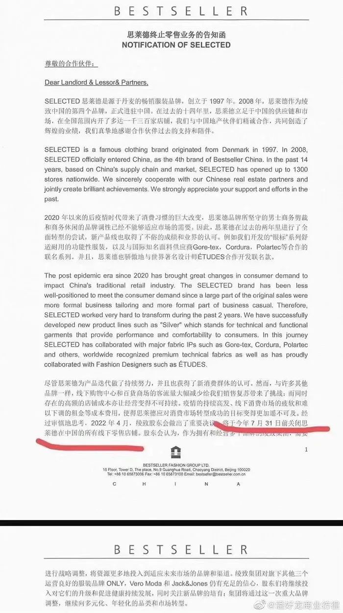 5月10日晚,一份有关思莱德SELECTED品牌终止中国零售业务的通知文件在网上流传。界面时尚询问部分相关消息的发布者,均得到回复称,前述文件是向供应商发布的内部通知。