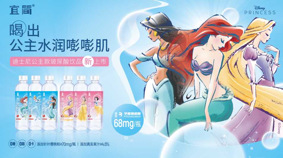 比如迪士尼公主系列的水光饮·玻尿酸饮品,选取了白雪公主、贝儿公主、茉莉公主、爱丽儿公主等6个经典角色。品牌选取的角色十分巧妙,每位公主的性格不尽相同,但她们所拥有的那些美好个性,不仅契合当代女性追求自信美丽、健康向上的性格,也与水光饮·玻尿酸饮品主打健康变美的理念不谋而合。