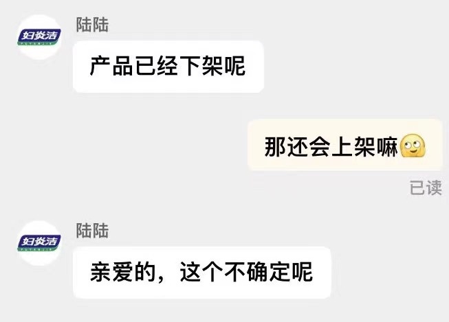 5月18日,有记者再次联系妇炎洁线上客服,其表示,公司对此事高度重视,产品已经下架,内部正在彻查。至于日后会不会重新上架产品,“尚不确定”。