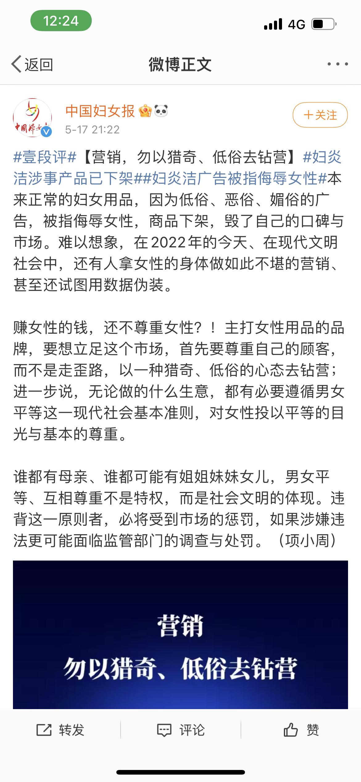 5月17日,#妇炎洁广告被指侮辱女性#一事登上热搜。对此,妇炎洁电商官方旗舰店客服回应称,公司对此事高度重视,产品已经下架,内部正在彻查。对带来的困惑与不便,深感抱歉。