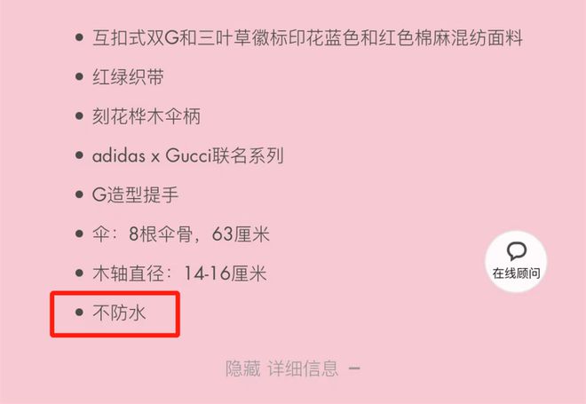 当然,最让人为之迷惑的是,售价11000元的雨伞根本不防水,14390元售价的那一款款雨伞的商品细节一栏虽然并没有明确标记不防水,但古驰的客服对于消费者的咨询回复称,不建议当作日常晴雨伞使用。