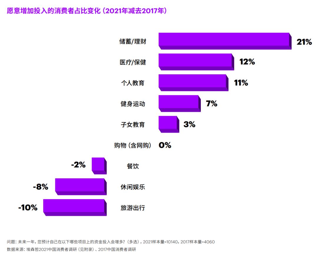 人们对文化享受和成长体验的需求也逐年增加。相比五年前,打算在个人教育方面增加投入的受访者增加了11个百分点,打算在运动健身方面增加投入的受访者增加了7个百分点。零售行业同样蕴含机遇。品牌若能通过产品和服务创新,为消费者提供既放松又有收获的美好体验,不仅能够增加消费者触点,获得增长,更能为消费者提供情感价值,赢得长期忠诚度。