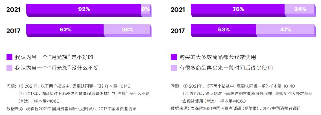 疫情冲击之下,人们的消费观念变得更加克制、务实。本次埃森哲调研显示,超过九成的受访者不认同“月光族”,比五年前上升了三成;近八成受访者“购买的大多数商品都会经常使用”,比五年前提高近两成。