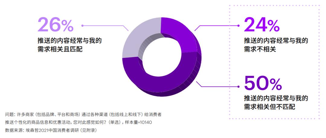 此外,消费者对于个人隐私和商家广告推送的忧虑也值得关注。本次埃森哲调研显示,七成受访者愿意为获取更好的服务而分享个人数据,但五成受访者认为推送频率过高,两成左右认为推送内容与自己完全不相关。